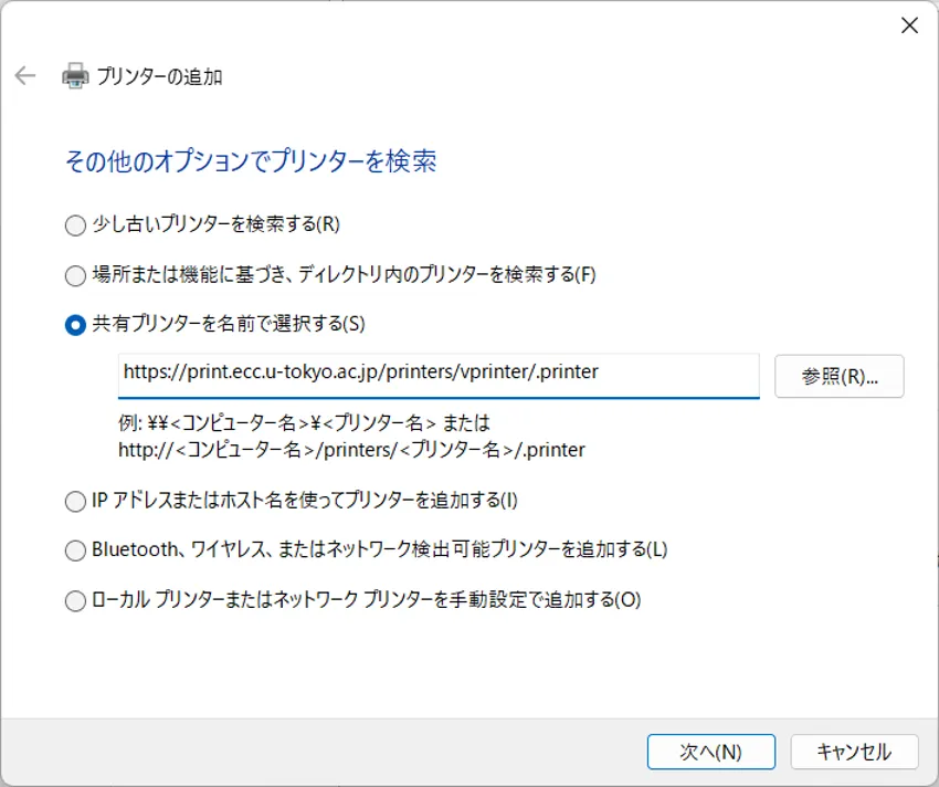https://print.ecc.u-tokyo.ac.jp/printers/vprinter/.printerを入力して,「次へ」ボタンを押してください.- ECCS2016では白黒とカラーでプリンタが分かれていましたが,ECCS2021では共通です.白黒・カラーは,印刷時の設定で指定してください.