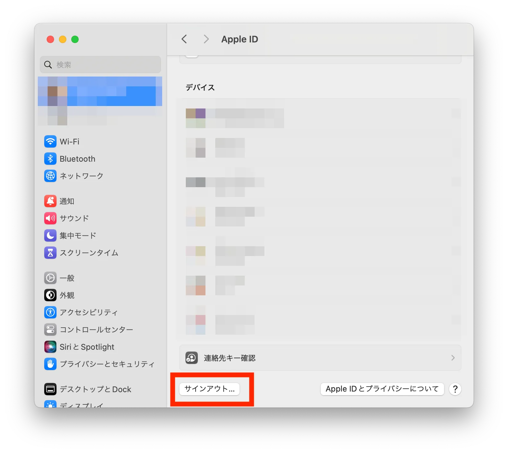 特段の事情等により上記ソフトウェアを利用する場合は,ECCS端末の利用を終了する前に,必ずApple IDのサインアウトを行ってください.サインアウトを行う際は以下の画像のように,画面左上のAppleメニューから「システム設定」を開き,「Apple ID」を選択後,下部にある「サインアウト」をクリックしてください.