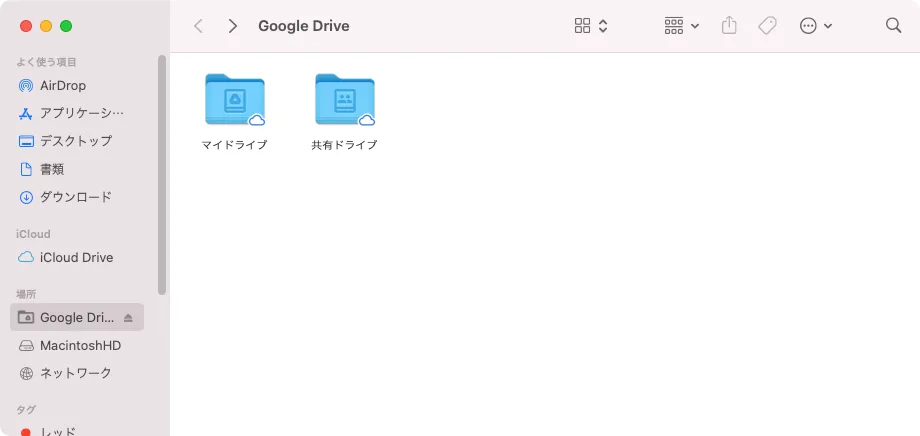 また,Finderの「場所」の中に「Google Drive」が追加されます. クリックすると以下のように各自のGoogleドライブの内容が表示され,アクセスが可能になります.PC内のファイルと同様にGoogleドライブのファイル操作ができます.