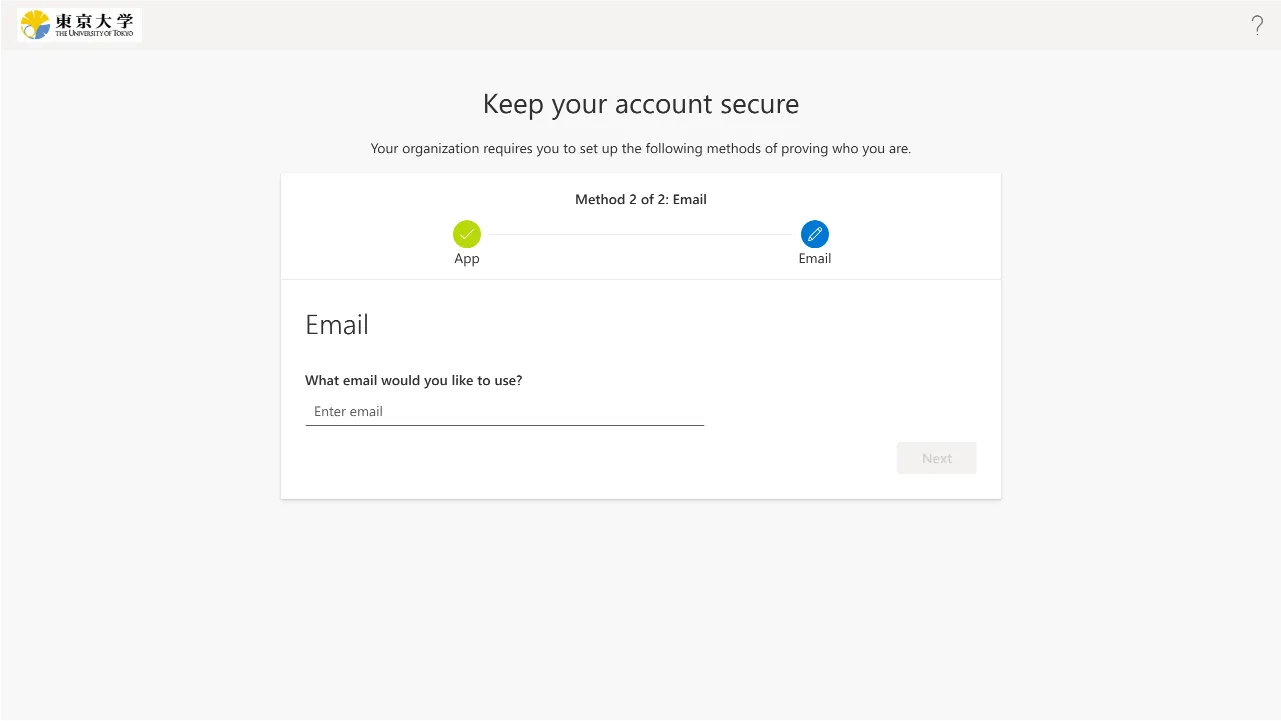 Regarding the registration of your email addressIf you register Yubico Authenticator application as the first verification method, you will be prompted to enter your email address after completing the code input test. Please enter an email address OTHER THAN your ECCS Cloud Email if possible, and click “Next”. Enter the 6-digit code sent to your email address, and click “Next”.