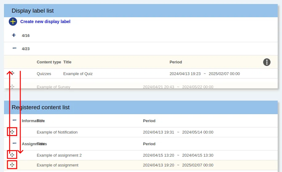 2. While holding down the drag-and-drop icon icon located at the left side of the content name, drag and drop the content.