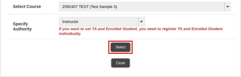 • Although it is possible for students to be registered with “Course Instructor” authority, it is recommended that you register them with “TA” authority whenever possible.
