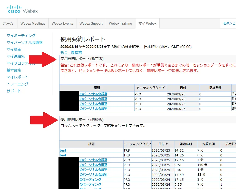 - A list of meetings will be displayed. If it is displayed in the “Usage summary report (provisional version)”, a proper report has not been generated yet. Please wait for it to be displayed in the “Usage Summary Report (final version)”. Click on the agenda name.