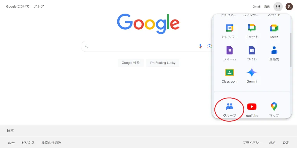 Webブラウザから利用する際は,Googleのサイトでログインした状態で右上の3x3のマスが並んだアイコンを押して表示されるメニューで「グループ」を選択してください.