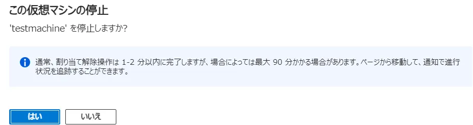 • 仮想マシンリソースの詳細で上部に、停止ボタンがあるのでクリックする.