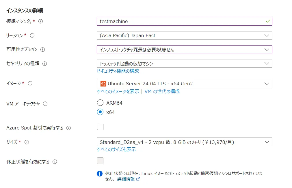 • 仮想マシン名:仮想マシンをAzure Portal 内で管理する際の名称です.わかりやすい名称を入力してくだささい.ここではtestmachineと入力しています.