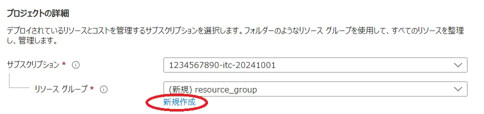 • サブスクリプション:事前に申請したサブスクリプションがすでに設定されていますので、通常はそのままで問題ありません.設定が無い場合はサブスクリプションが作成完了しているかどうか確認ください.