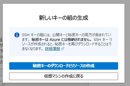 • SSH鍵の新規作成を選択した場合,SSH鍵ペアの秘密鍵をダウンロードするかどうかの選択が表示されるので,ダウンロードしてください.リモートから初期アクセスする際にこの秘密鍵を使ってログインします.作成した仮想マシンにログインするリモート端末の適切な場所に,秘密鍵を事前に配置してください.
