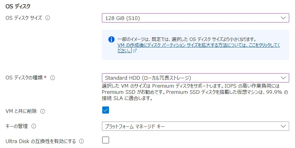 • OSディスクサイズ:いくつかのサイズから選択できますので,必要な容量を選択ください.