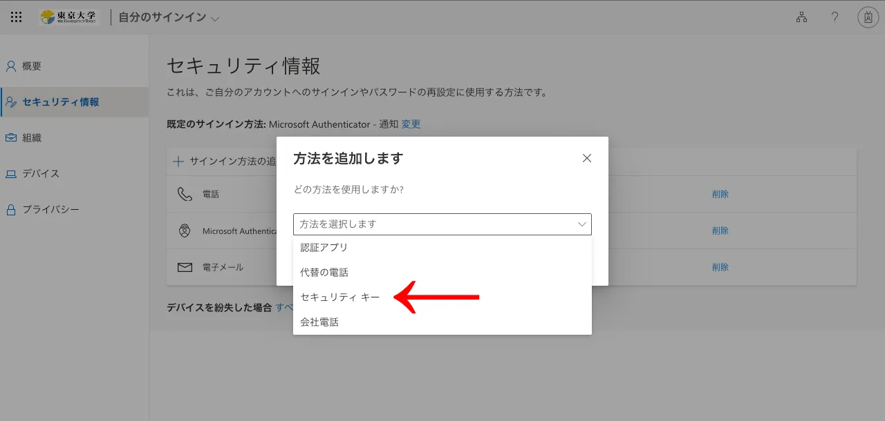 - 「方法を選択します」を押して,現れる選択肢から「セキュリティキー」を押し,「追加」を押してください.