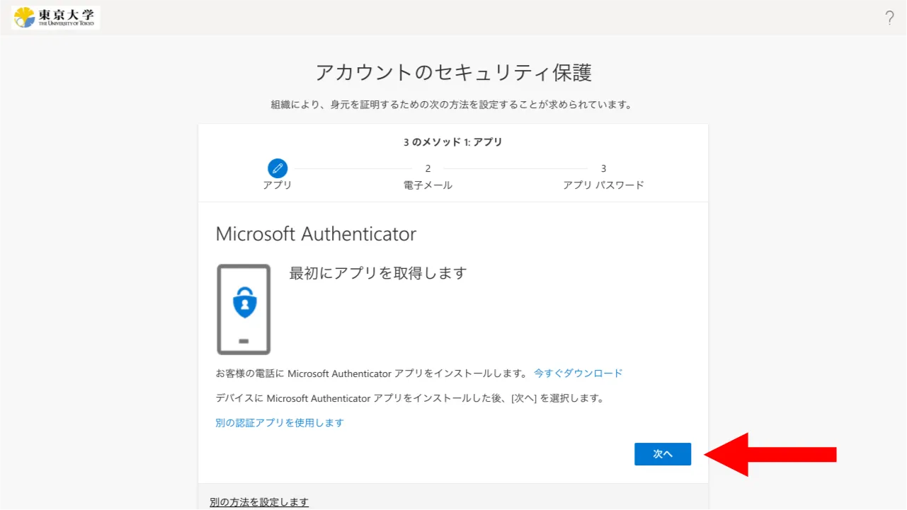 Microsoft Authenticatorの設定をする画面が表示されるので,そのまま「次へ」を押してください.