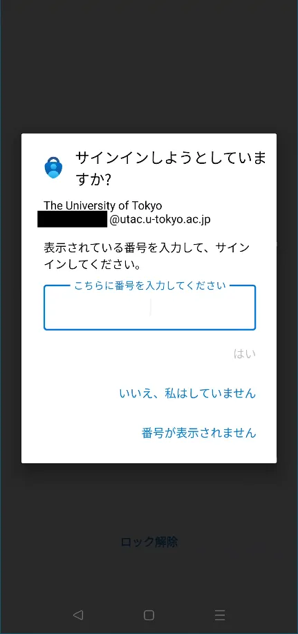 - Microsoft Authenticatorの場合:スマホに通知が送られ,サインイン画面に表示されている2桁の数字を入力するように求められるので,そのようにしてください.