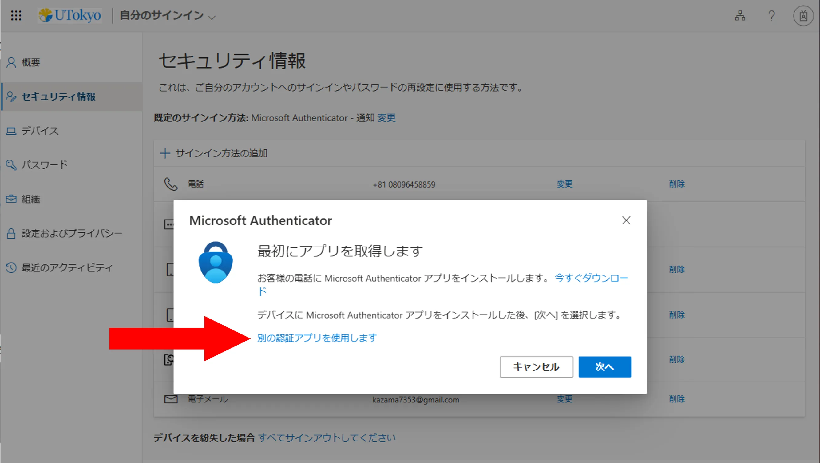 @utac.u-tokyo.ac.jp)とパスワードを入力してください. - 「詳細情報が必要」という画面が表示されるので,「次へ」を押してください.
