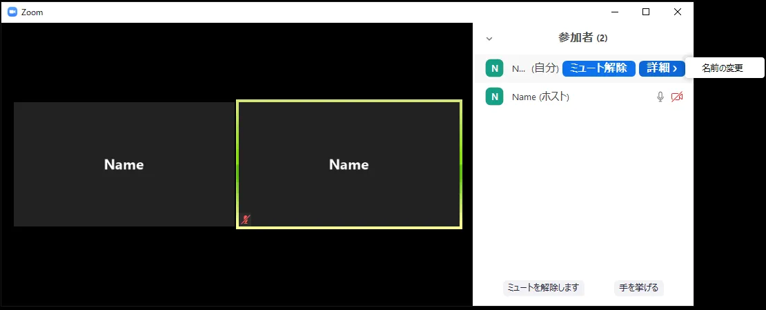 - 自分の名前のところにマウスカーソルを合わせると,ミュートのオン,オフ,詳細より表示される名前の変更,プロファイル画像の変更が行えます.
