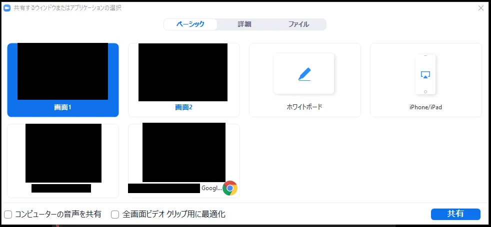 メニュー「画面の共有」を押すと,共有する画面の選択肢が出てきます.希望のものを選択して「共有」を押すと,画面の共有が始まります.