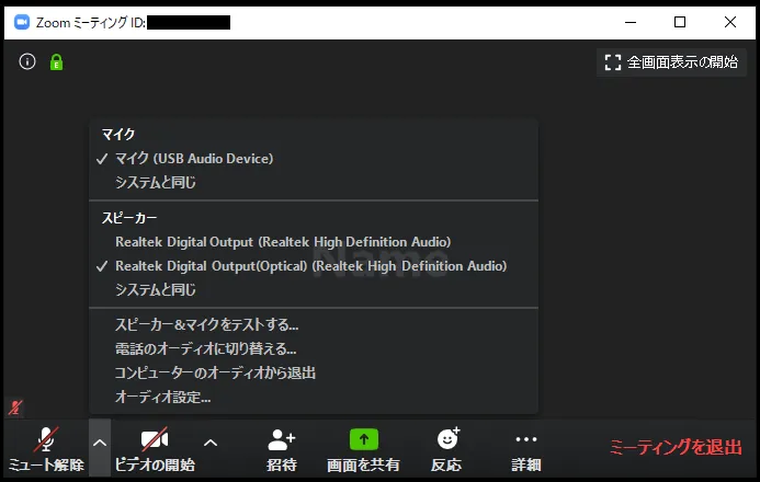 - マイクマーク : これを押すことによってミュート(消音)にしたり,ミュートを解除できたりします(画面では現在ミュート状態であるため「ミュート解除」と表示されています).横にある上マークを押すとマイクに関する設定ができるようになります.