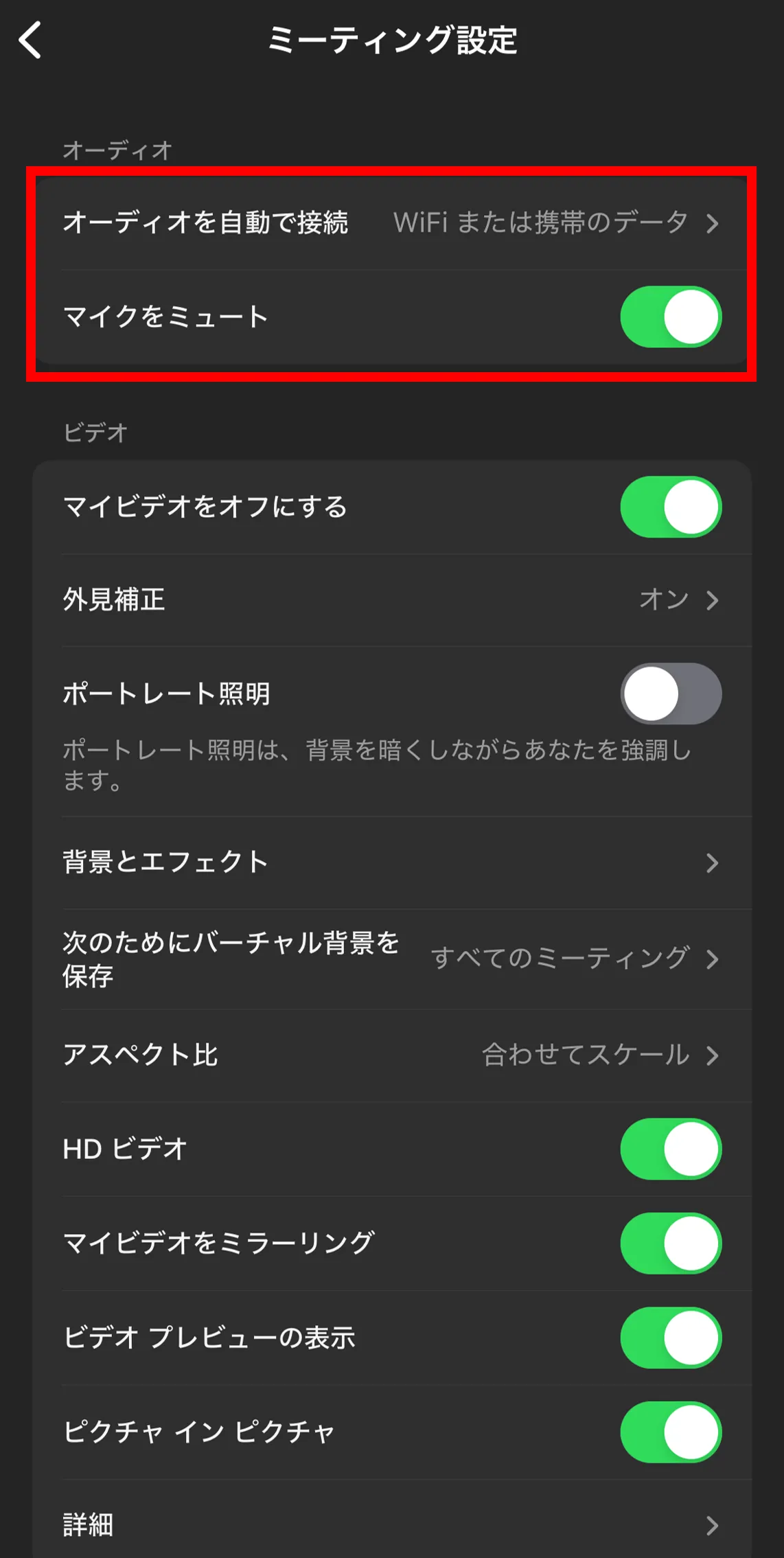 詳細タブの中の,「ミーティング」を押すと,ミーティング中のオーディオやビデオの設定を行うことができます.